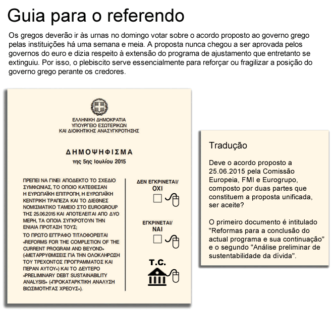 | Política interna | Em caso de vitória do "sim" o governo de Alexis Tsipras poderá cair, forçando a convocação de eleições antecipadas. Continuará a incerteza em relação à posição de um futuro governo sobre o ajustamento. | Se resistir à vitória do "sim", Alexis Tsipras terá de convencer a facção mais crítica da UE no seu partido para negociar um terceiro resgate. Em alternativa, poderia procurar acordos com outros partidos. |